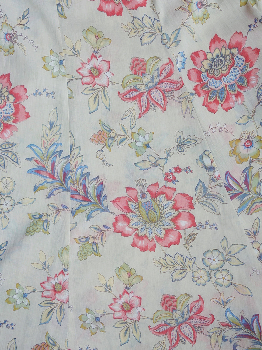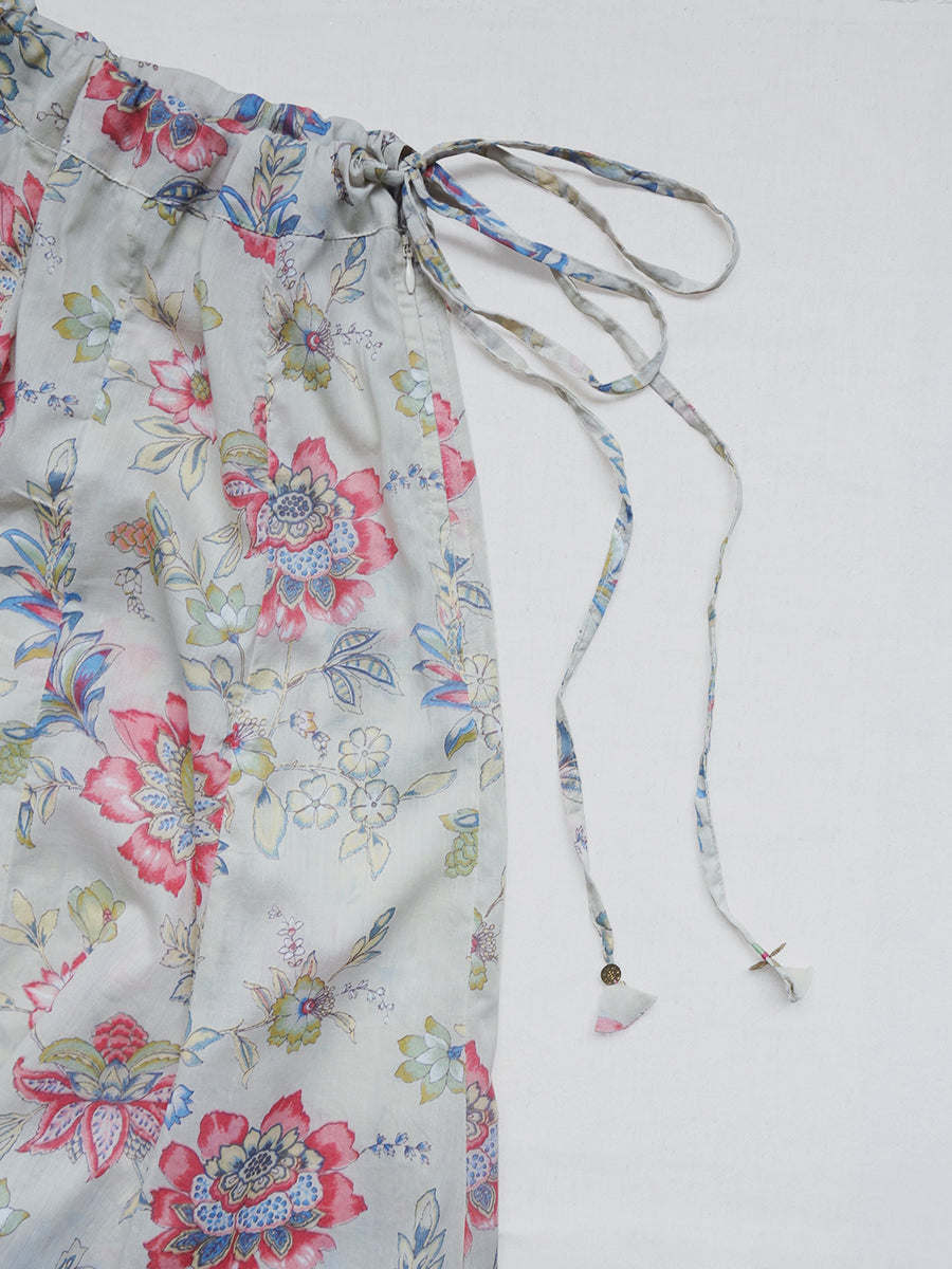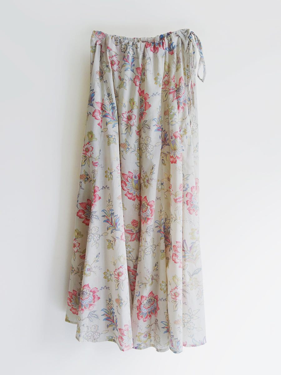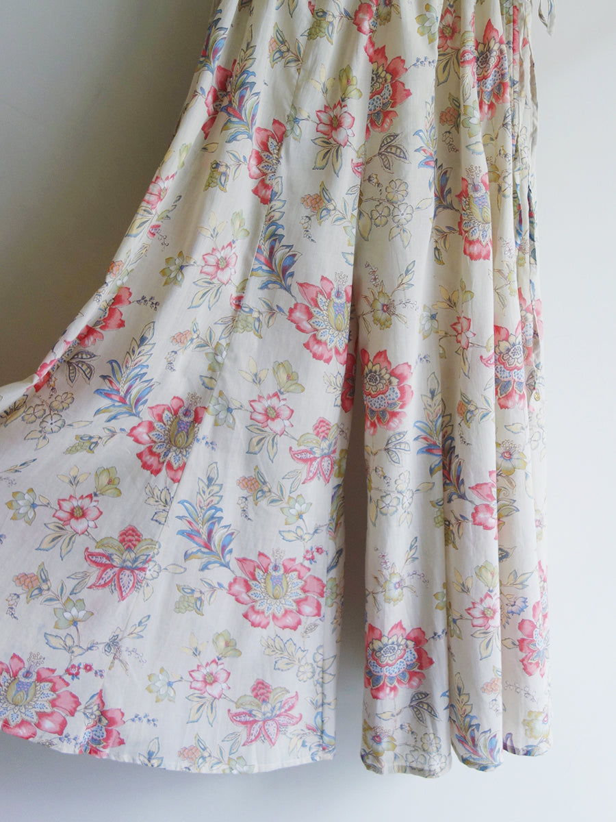 一見スカートのようにも見える、フレアが豊かで軽やかなフレアパンツです。ベージュをベースにピンクの花々が描かれた可憐なテキスタイルが女性らしさを引き立てます。さらりとした肌触りで蒸れにくく、履き心地のよい一枚。左ファスナー、右ポケット付き。ウエストは細い紐リボンでゴムなし。紐リボンの端にさりげなくあしらわれたゴールドのチャームがおしゃれ心をくすぐります。