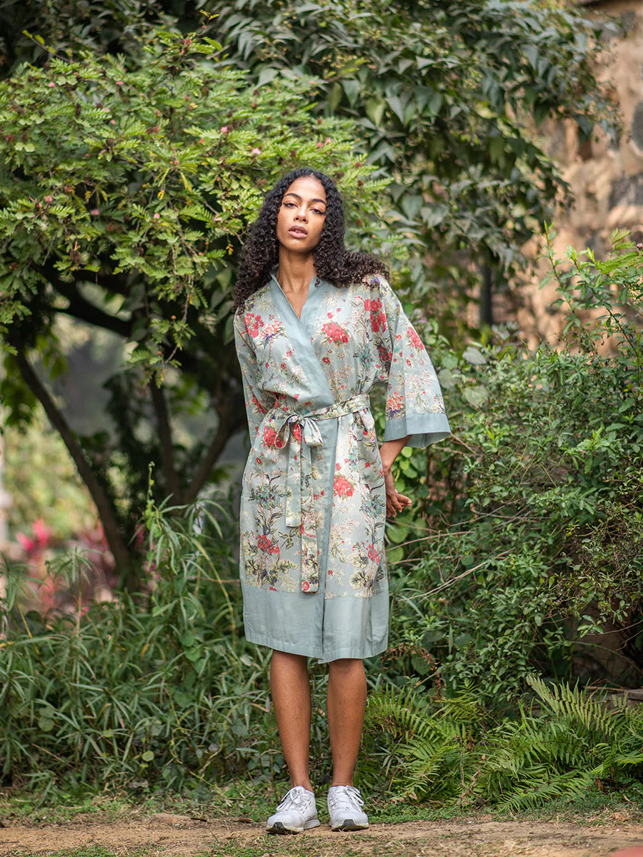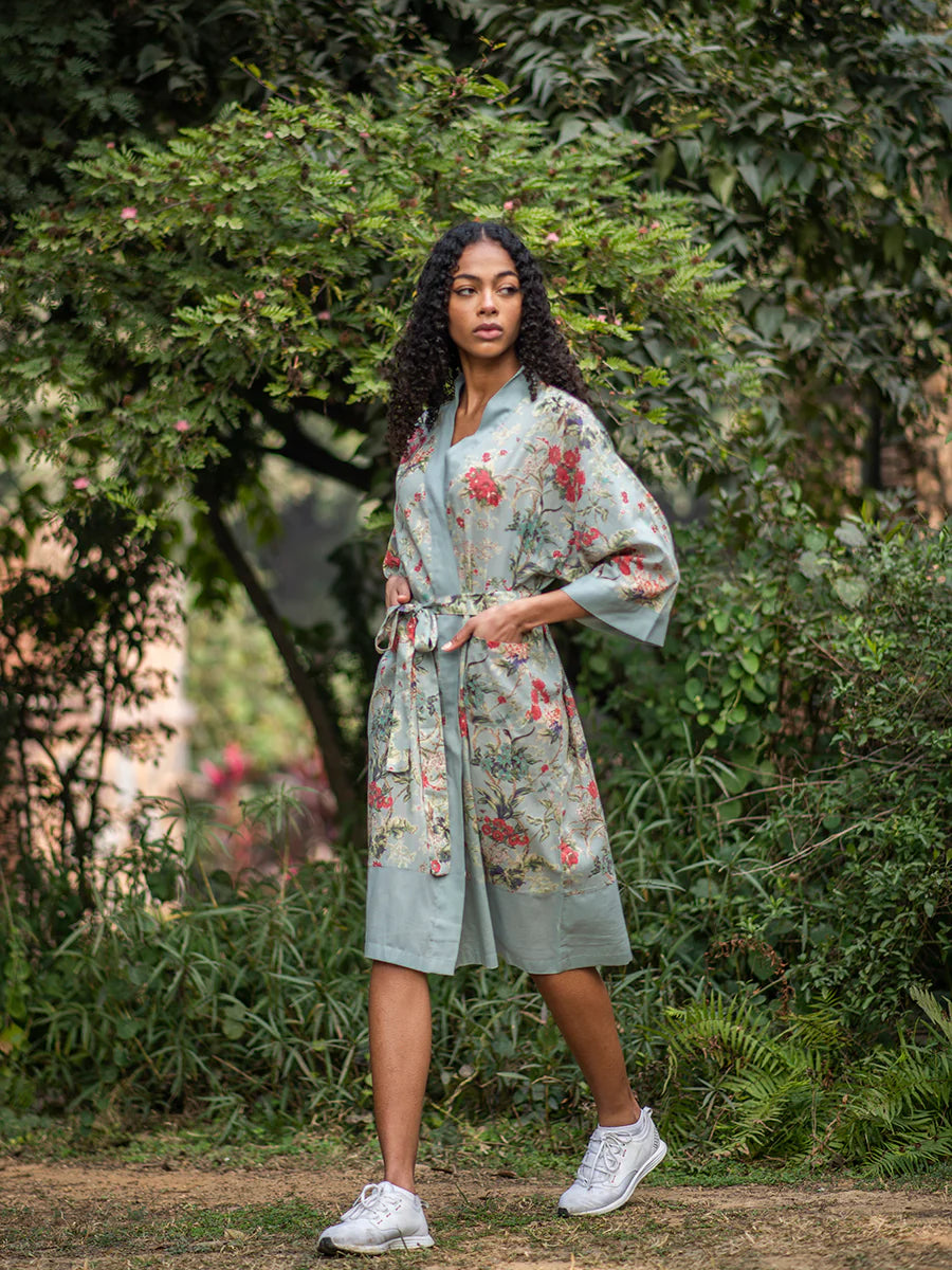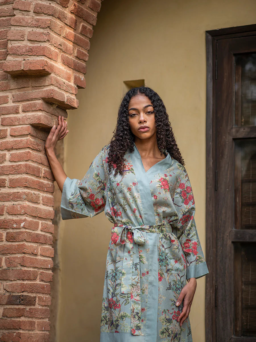 軽く柔らかなインド綿が心地よいキモノローブ。ルームウェアにするのはもちろん、Tシャツやワンピースの上からさらりと羽織っても。共布のベルトリボン付き。