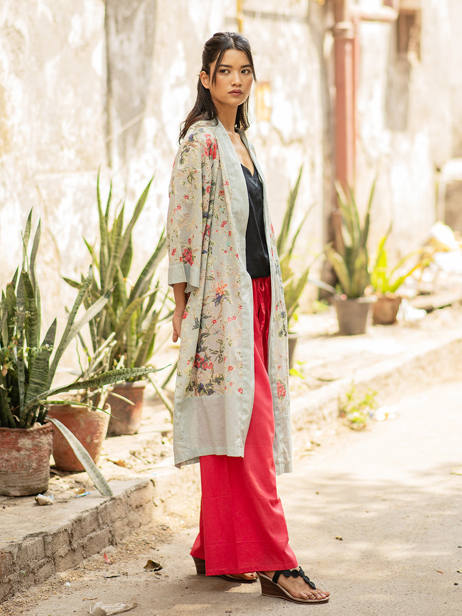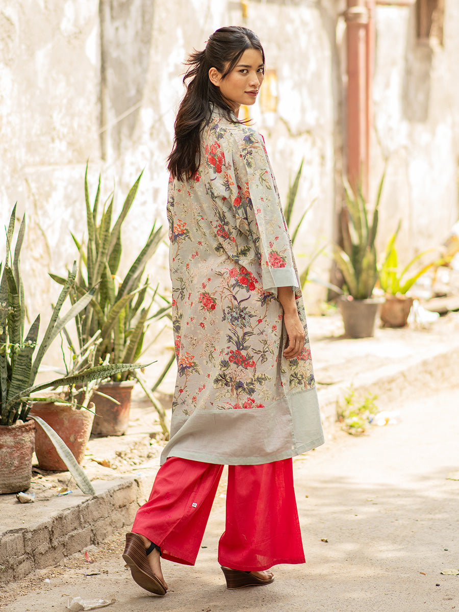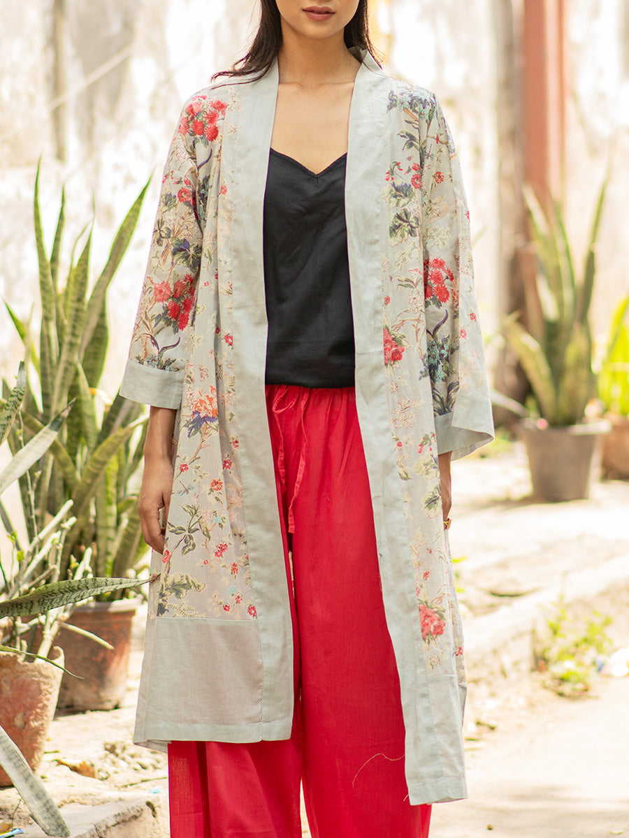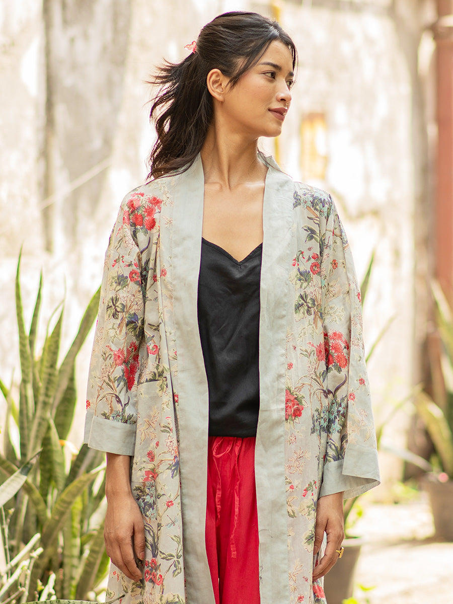 軽く柔らかなインド綿が心地よいキモノローブ。ルームウェアにするのはもちろん、Tシャツやワンピースの上からさらりと羽織っても。共布のベルトリボン付き。