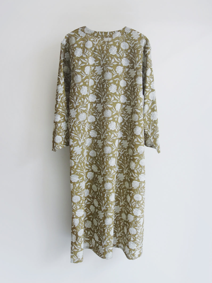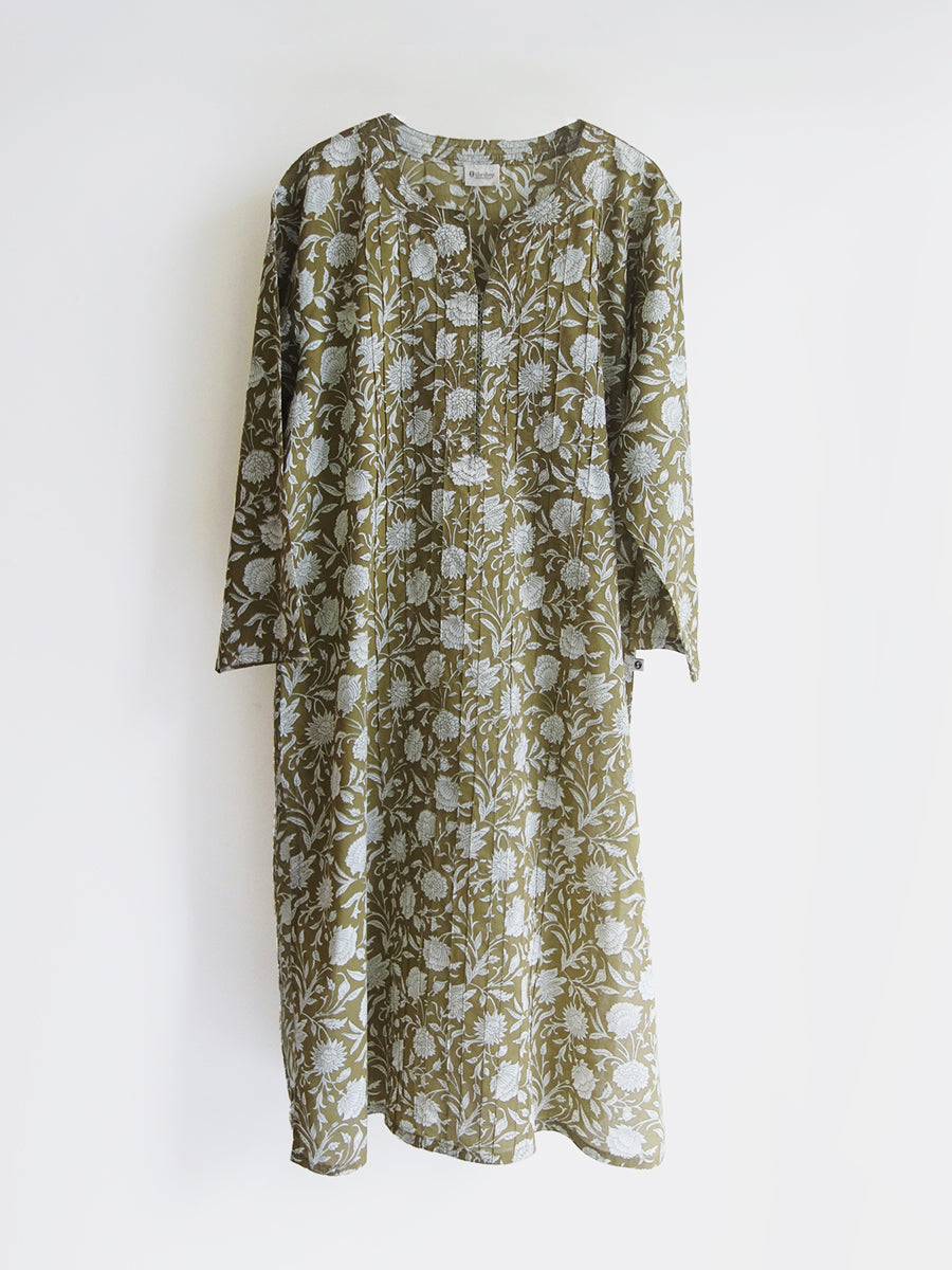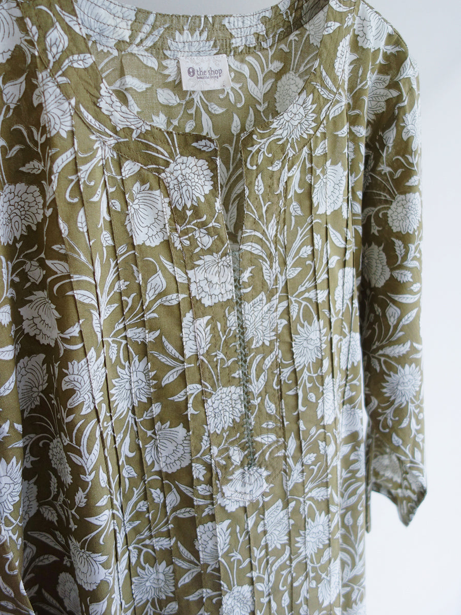 インドの民族衣装のクルタを現代にアレンジしたチュニックです。長めのスリットで足さばきがよく、動きやすいデザイン。胸元の透かしステッチやピンタックがポイント。伝統的なブロックプリントの柄が映えます。