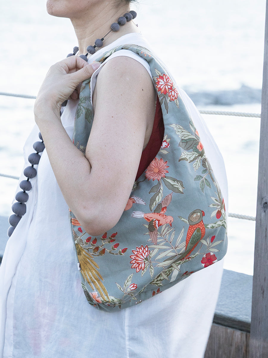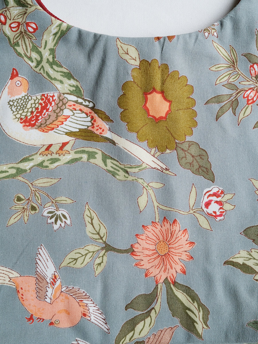 日本オリジナルのラウンドトートバッグ。人気のBird Manosqueプリントです。シックなセージグリーンにオレンジがアクセント。きれいなラウンド型で、カジュアルすぎず、大人スタイリングの素敵なアクセントに。