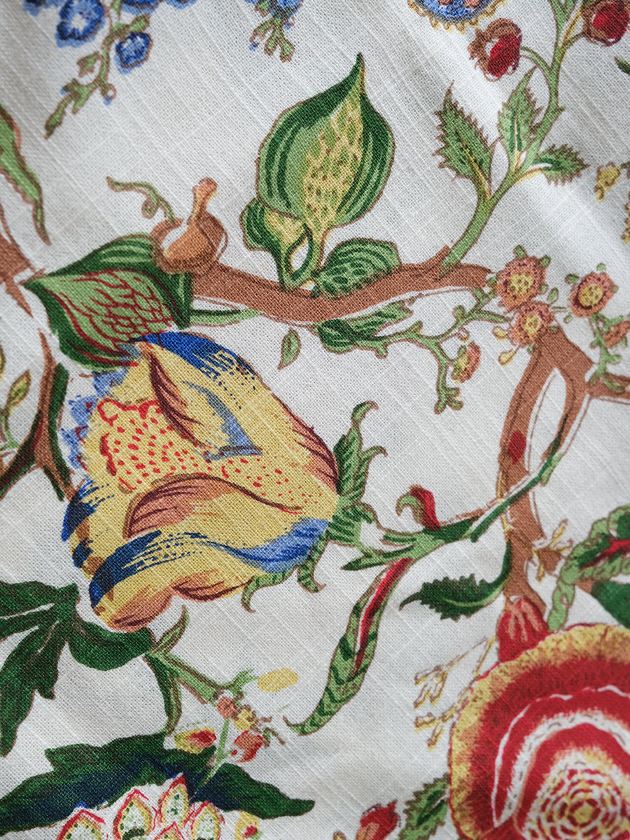 白地にエキゾチックな大輪の赤い花や植物がいきいきと描かれた「Sequoia Cream」をプリントしたクッションカバー。力強さと爽やかさを兼ね備えた、異国情緒のあるデザインが魅力。ひとつでも存在感があり、インテリアのポイントになります。お気に入りのクッションと組み合わせても素敵。